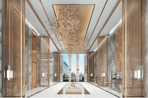 Stainless steel is widely used for entrance door frames, wall cladding, ceilings, and reception desks. It creates a modern and upscale atmosphere.